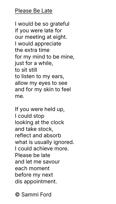 As someone with ADHD, it can be so hard to be on time, so I wrote this poem to express my feeling that we should take time out every now and then. It was shortlisted in the Hammond House International Literary Award and published in the anthology entitled Time.