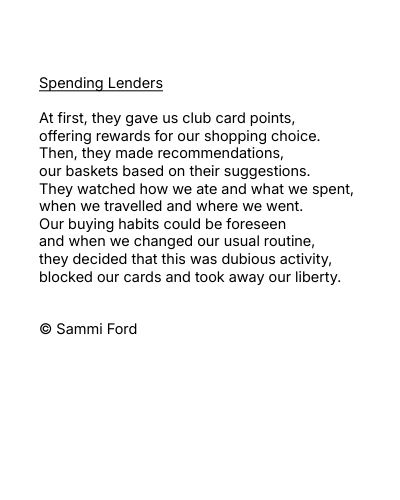 Nowadays, we all use cards instead of cash, but this enables companies to monitor our spending and analyse us as data. It will only get worse, so this poem tackles the subject with a touch of humour.